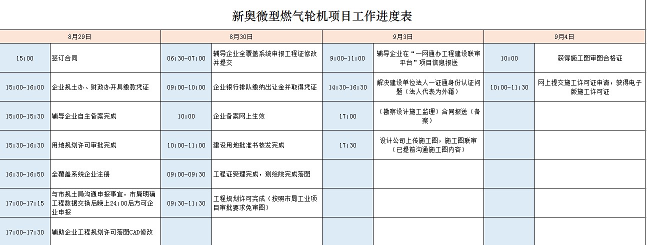 短短五天,临港的“店小二”们怎样带领企业跑出新片区加速度?从澎湃新闻(www.thepaper.cn)获得的一份新奥微型燃气轮机项目工作进度表上可以发现,答案都在细节中:各项日程排得满满当当、每个步骤紧密衔接,进度安排精确到分钟,直到9月4日中午,新奥能源负责人拿到了项目开工前最后一道、也是最关键的手续“施工许可证”。