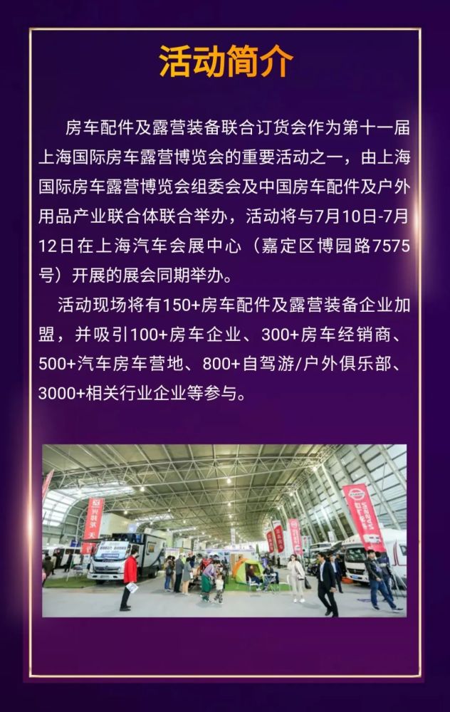 第十一届上海国际房车展力求给广大行业企业提供更多商机,并向广大专业观众展现一场展品多样、装备齐全、活动丰富的国际化的行业盛会。欢迎广大企业前来参展洽谈合作,也欢大家迎届时到场观展,寻求商机!