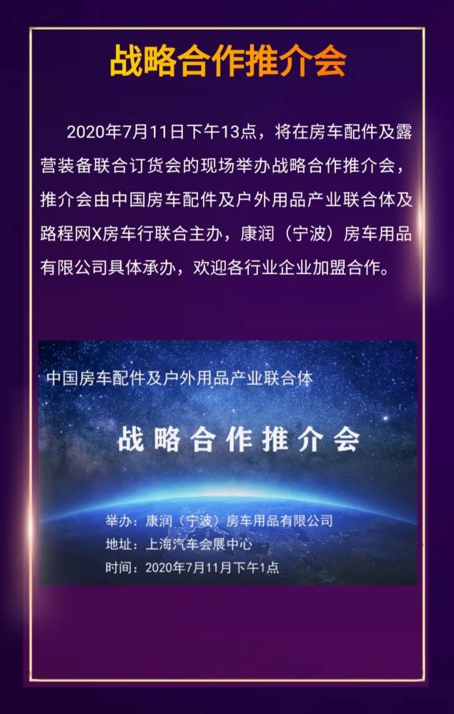 2020年6月7日,第十一上海国际房车露营博览会(以下简称:上海国际房车展)新闻发布会在上海房车行超市盛大召开。会上,中国房车配件及户外用品产业联合体与上海国际房车展组委会达成战略合作伙伴关系。旨在布局中国房车配件产业链,为中国房车配件产业的更好更快发展贡献一份力量!