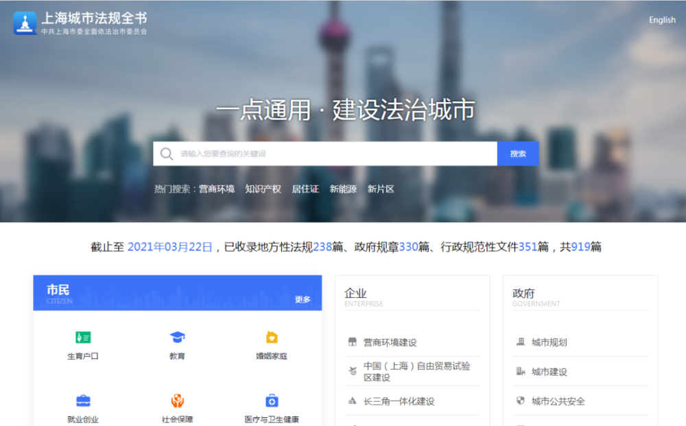 进入上海市人民政府门户网站,在下方“政务公开专题”一栏,就能找到“上海城市法规全书”入口。点击进入页面,“一点通用·建设法治城市”的标语映入眼帘。下方实时更新的数据显示,截至今年3月22日,已收录地方性法规238篇、政府规章330篇、行政规范性文件351篇,共919篇。